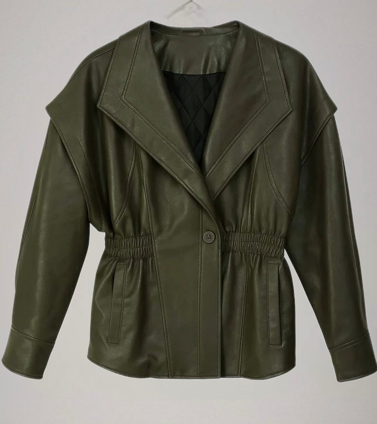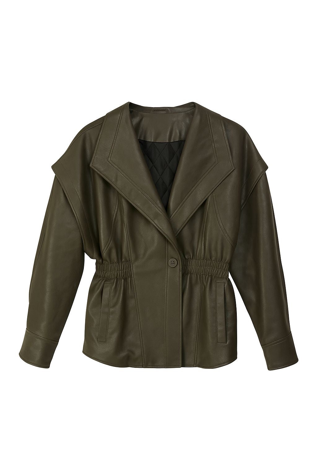 Adopte un style à la fois chic et audacieux avec cette veste en simili cuir kaki .