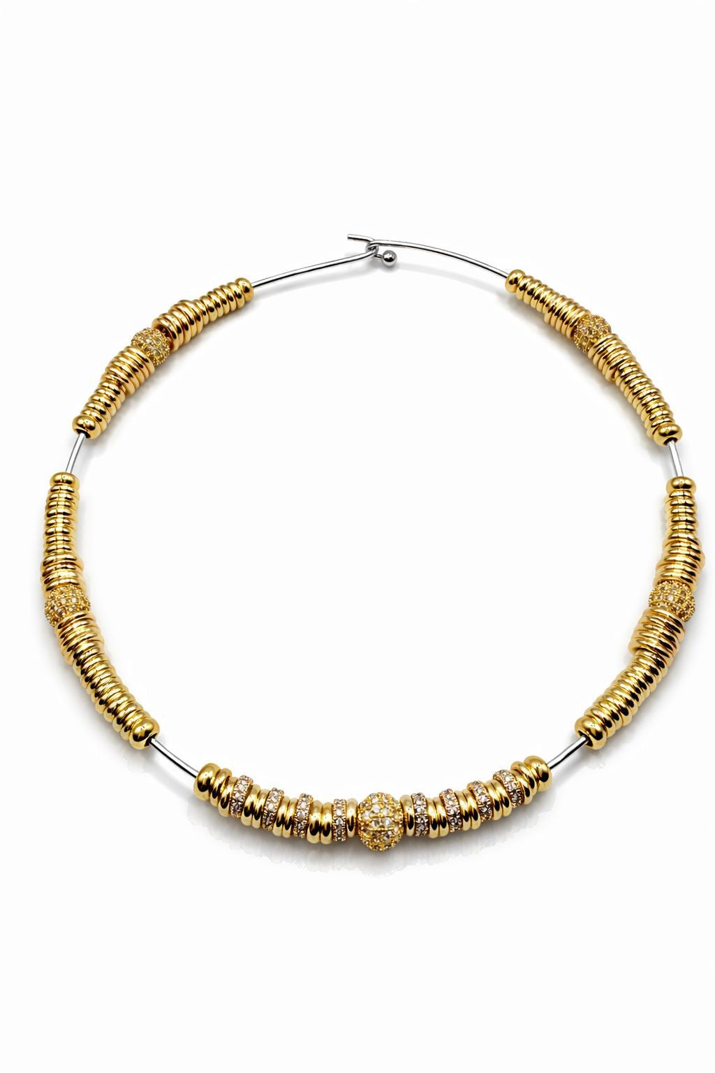 Le Collier Mélira est en laiton doré à l’or fin verni deux fois, avec des rondelles en hématite.