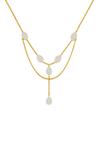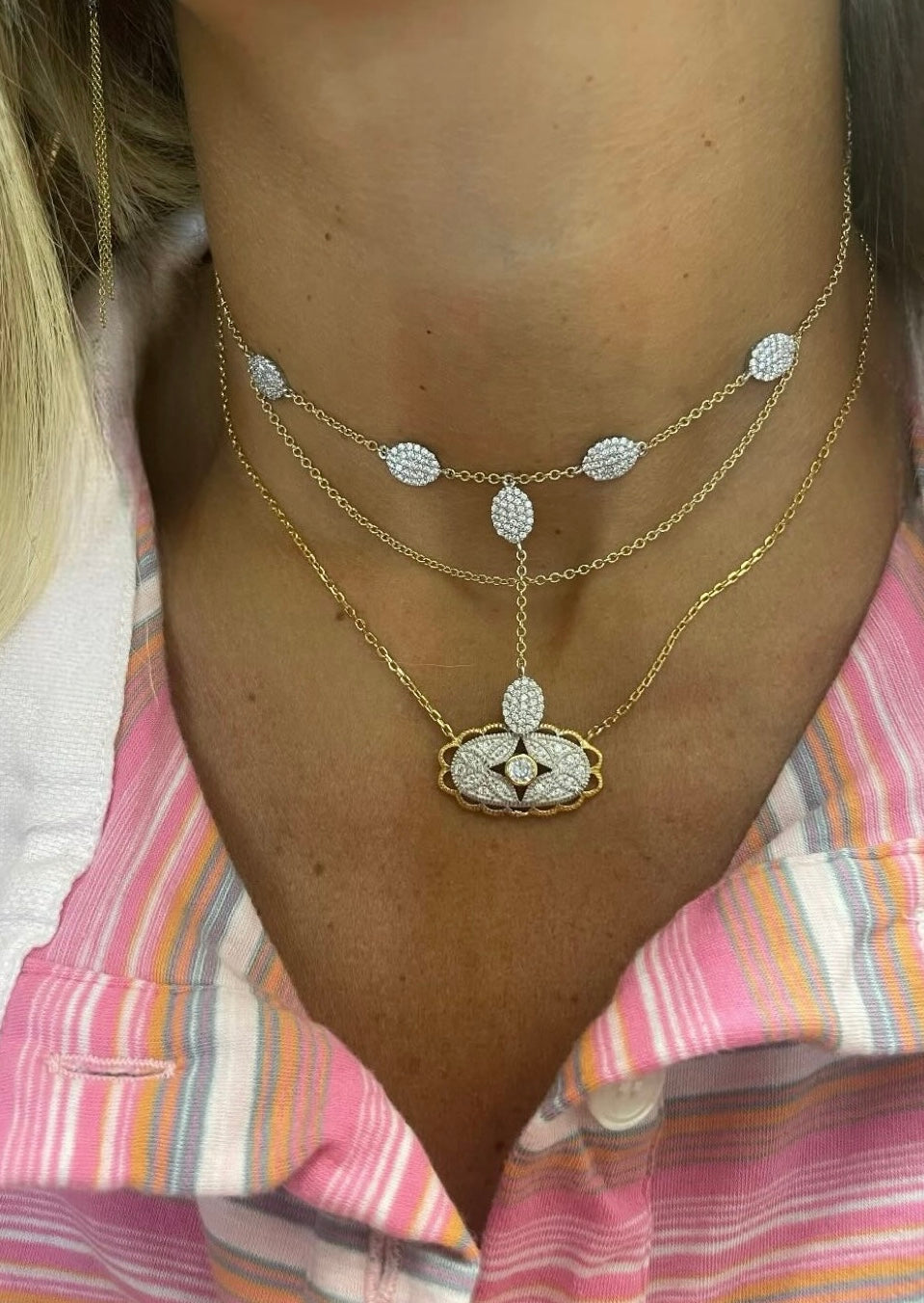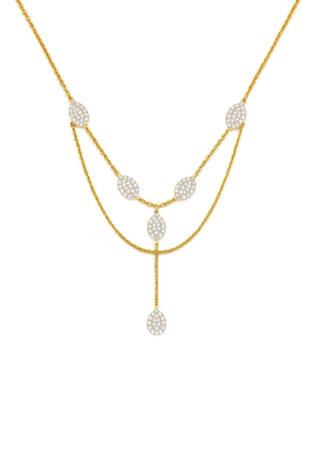 Le collier Pera est en plaque or jaune il est orné d'ovales en zirconiums blanc et une chaîne tombante . ( collier du haut sur la photo )